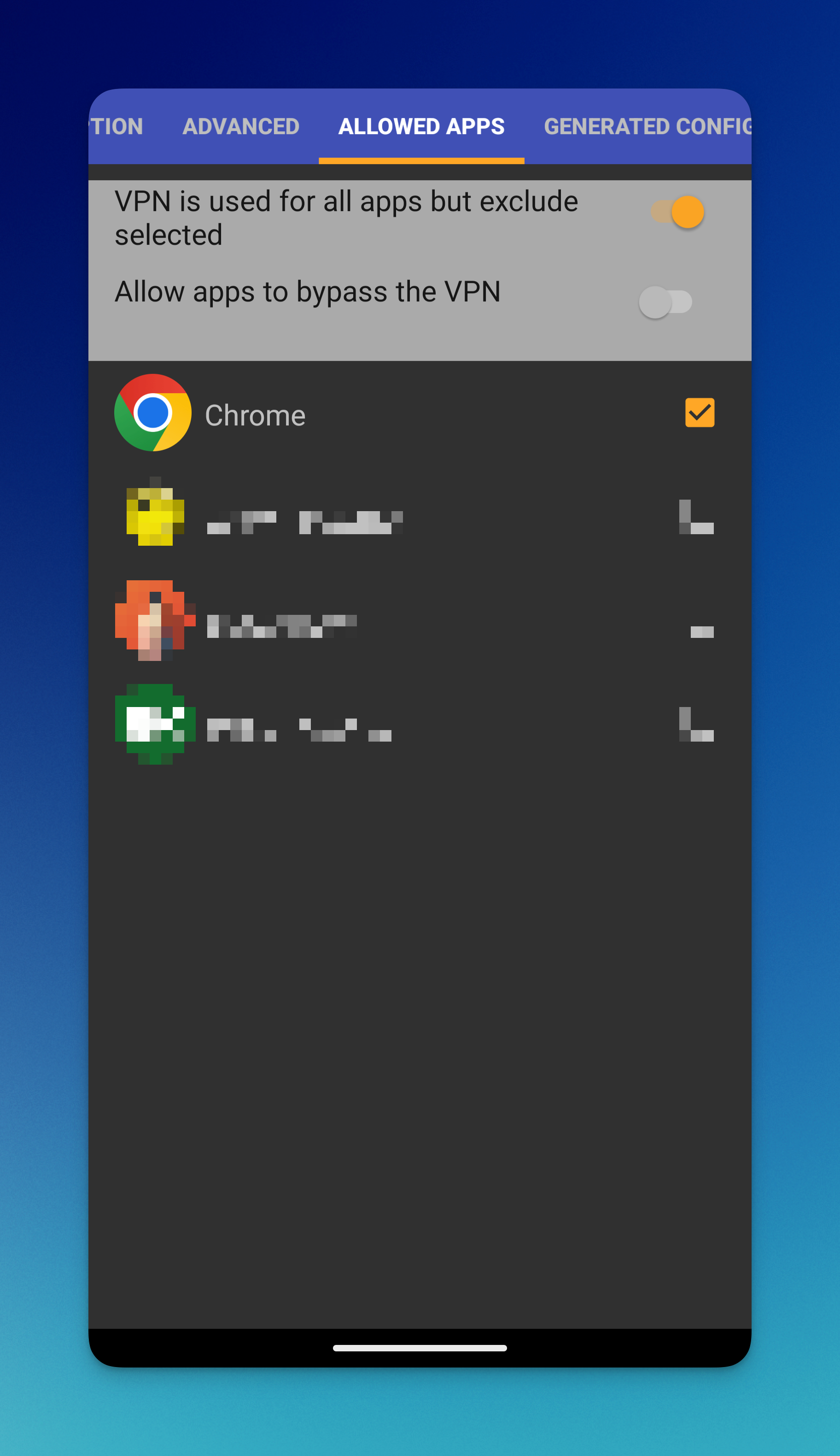 Оставьте переключатель рядом с надписью VPN is used for all apps but exclude selected (Использовать VPN для всех приложений, кроме выбранных) в положении Включено. Далее выберите приложения, которые будут работать без VPN (например, браузер).