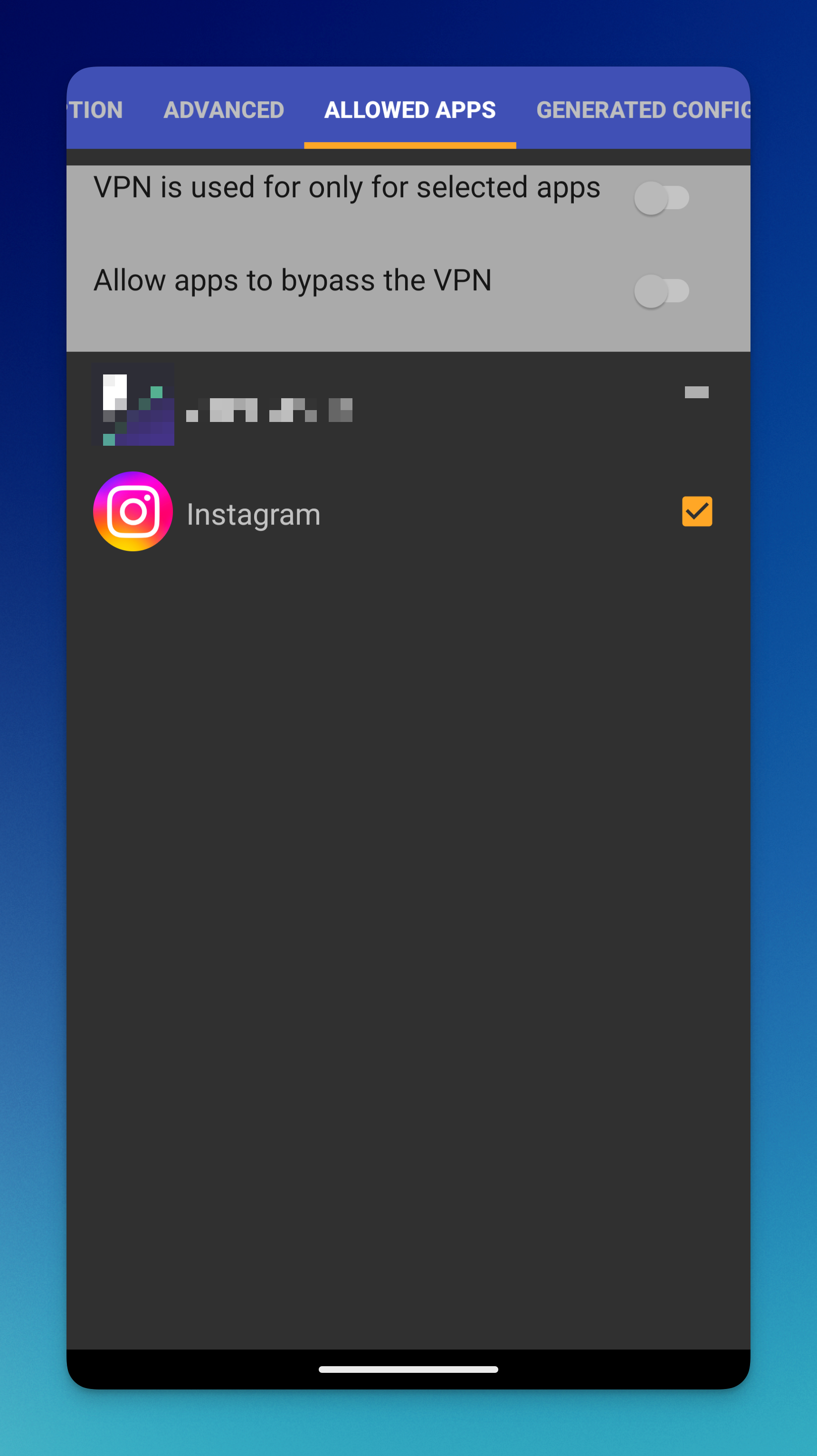 Переведите переключатель рядом с надписью VPN is used for all apps but exclude selected (Использовать VPN для всех приложений, кроме выбранных) в положение Выключено. Далее выберите приложения, которые будут работать с помощью VPN (например, социальные сети).